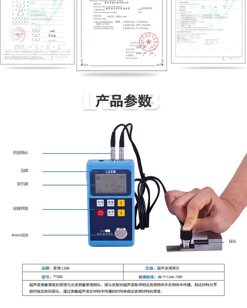 | 测量精度 | ±(1%H+0.1)mm, H为实际厚度值 |