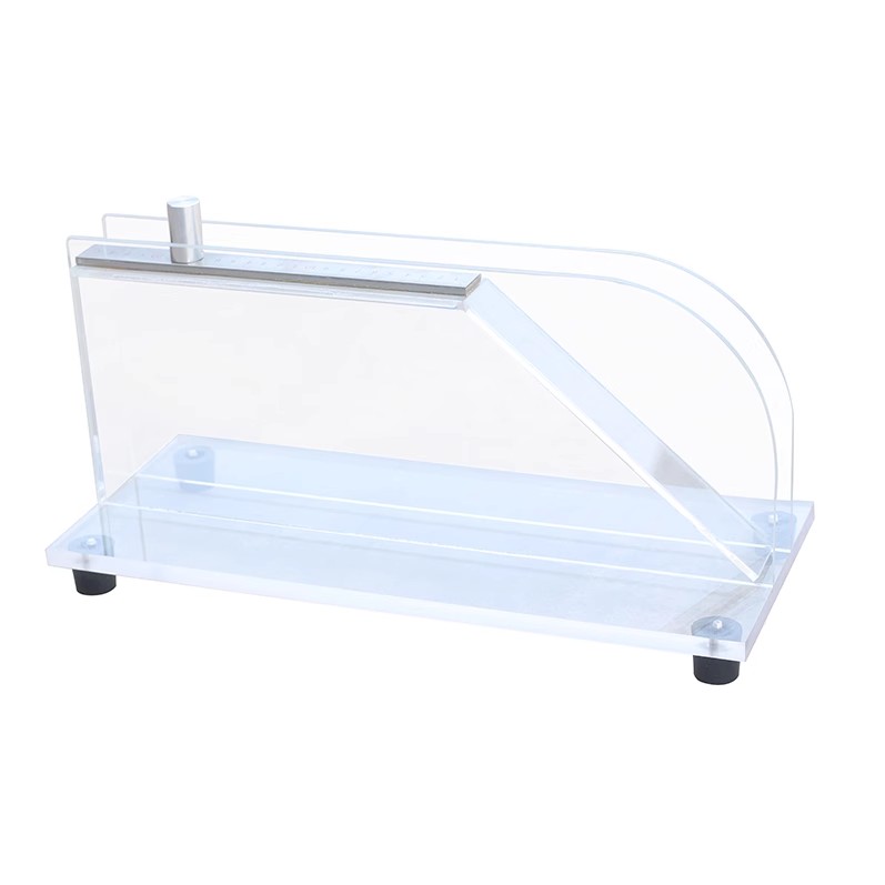 【工作原理】:一矩形试样放在水平平台上,试样长轴与平台长轴平行。沿平台长轴方向推进试样,使其 伸出平台并在自重下弯曲。伸出部分端悬空,由尺子压住仍在平台上的试样的另一部分。