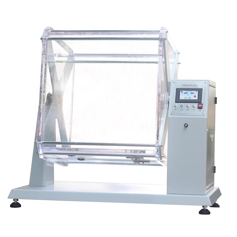 将试样制成袋状,内装一定质量的羽绒,放试验仪的回转箱内,同时在回转箱内还装入硬质橡胶球。回转箱以一定速度转动,将橡胶球带一定高度落下,冲击试样,达到模拟羽绒制品在服用过程中的各种挤压,揉搓,碰撞等作用。通过计数从试样内部钻出的羽绒根数来评定织物的防钻绒性能。