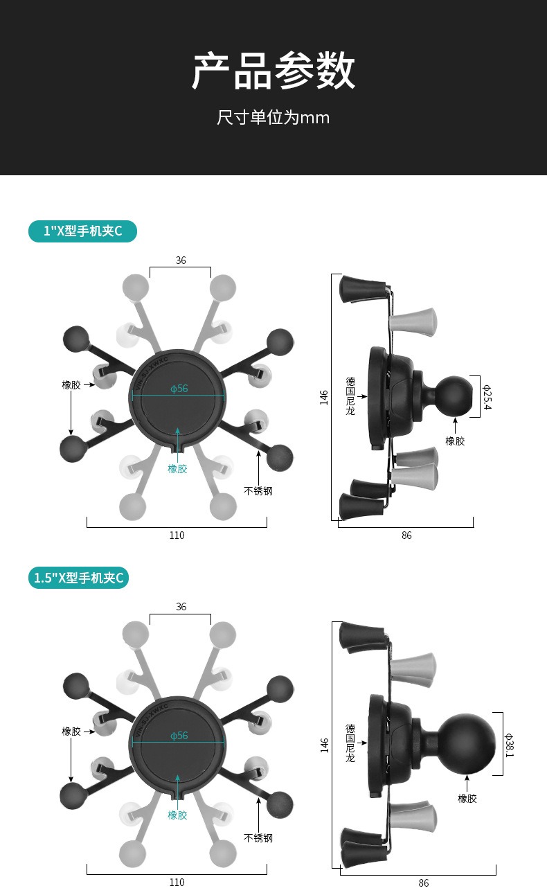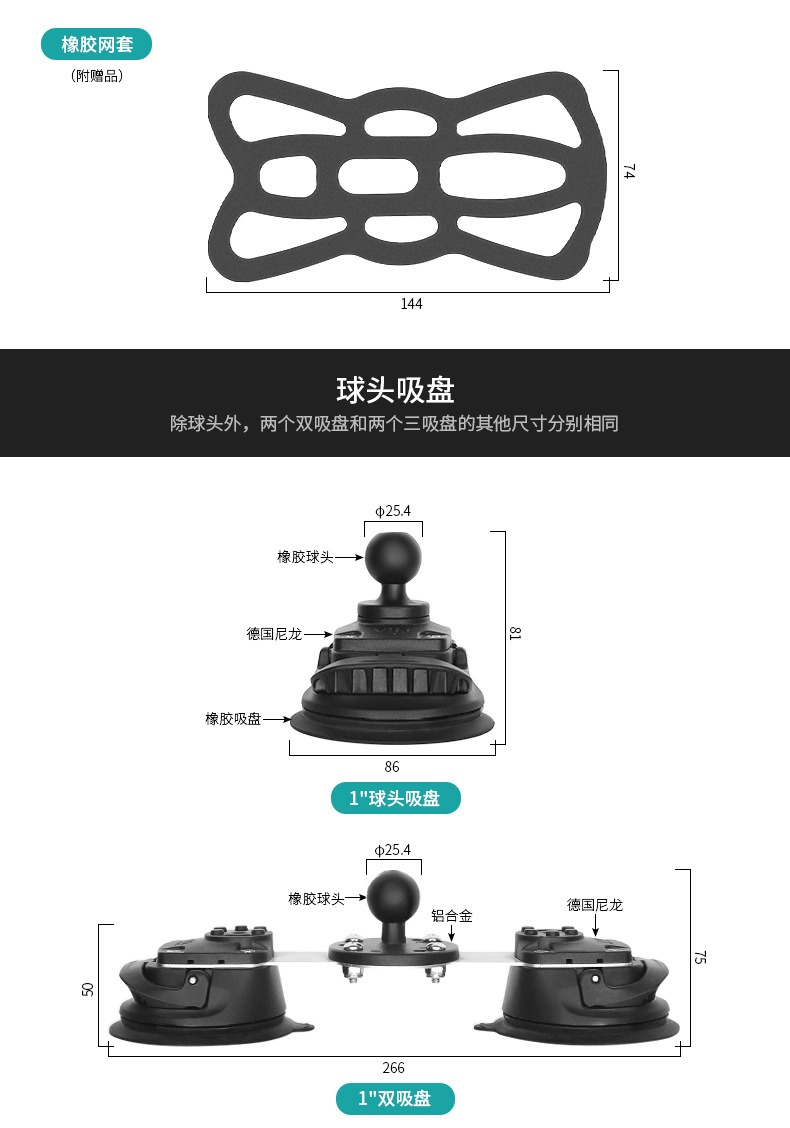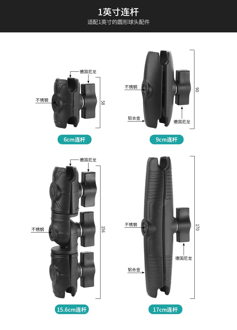 1英寸三吸盘+15.6cm连杆+1英寸手机夹C(赠橡胶网套)
