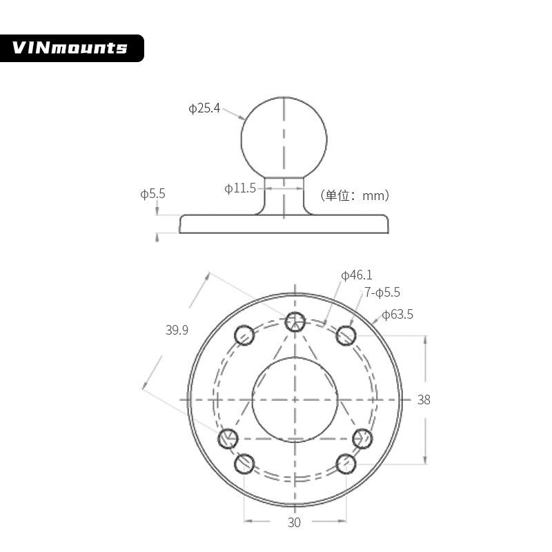 祈色叉车货车车载平板支架底座1英寸球头AMPS标准30x38孔距球头底座
