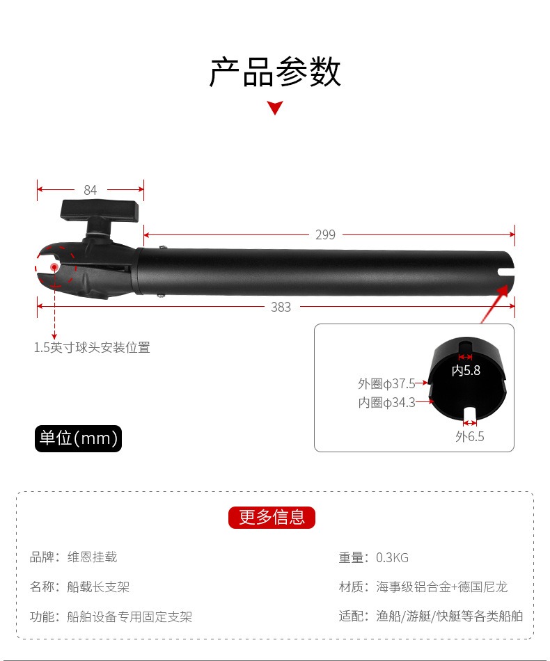 当前位置:首页 » 产品中心 » 祈色船载立柱式35mm直径圆管安装支架兼容1.5英寸球头40cm铝合金连杆