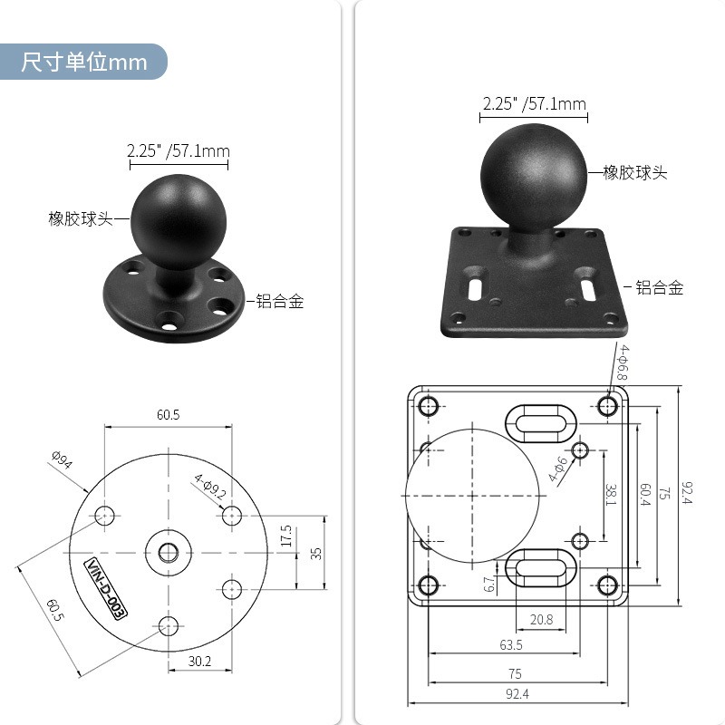 祈色VIN维恩双球头支架VESA75*75底座2.25英寸球头车载终端支架