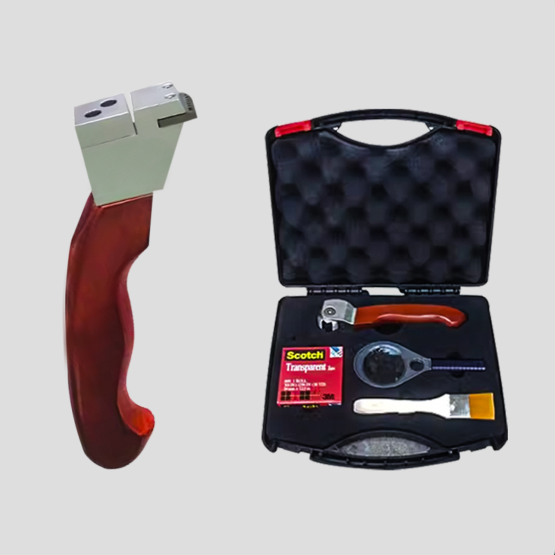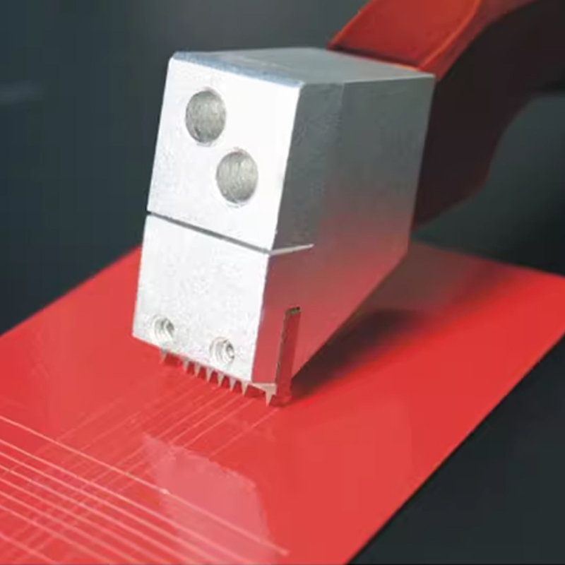我公司提供两种不同刀头的划格器,一种是有6个或8个切刀面的圆周多面型(2mm/11格除外),一种是单面刀片基本型。这些刀均由坚硬的合金钢精密加工而成。刀为的尺寸严格控制在标准要求的偏差范围内:刀对齿顶宽度小于0.05mm;刀为夹角为30°土1°。