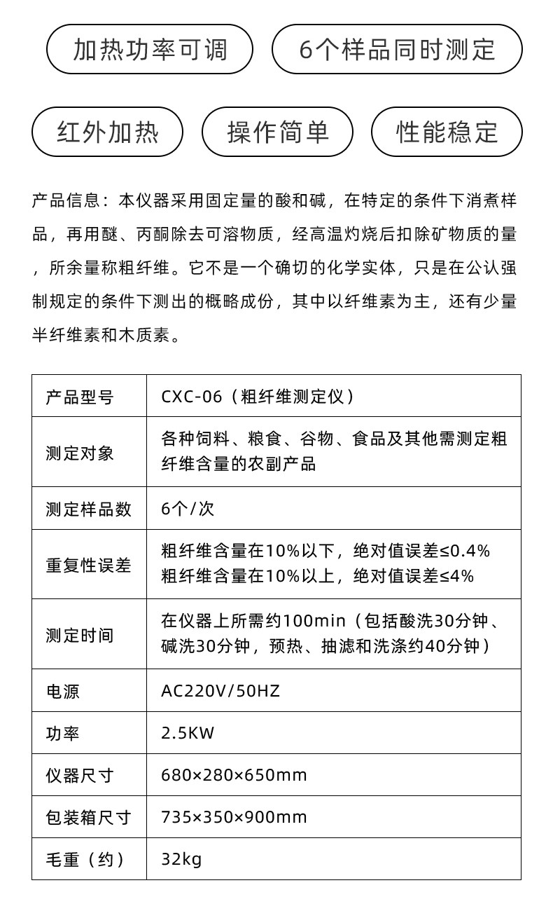 齐威粗纤维测定仪CXC-06粮食饲料谷物等粗纤维素含量测定农副纤维