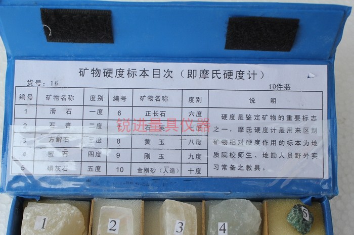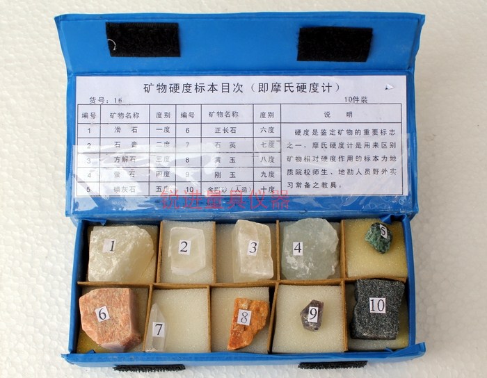 使用方法:如有一种未知硬度的矿物,用它能刻划正长石,但不能刻划石英,则此矿物的硬度可定为6.5度。其他可依此类推。在野外考查或没有上表中的矿物时,还可以用指甲或一些常见的工具来鉴定矿物的硬度。