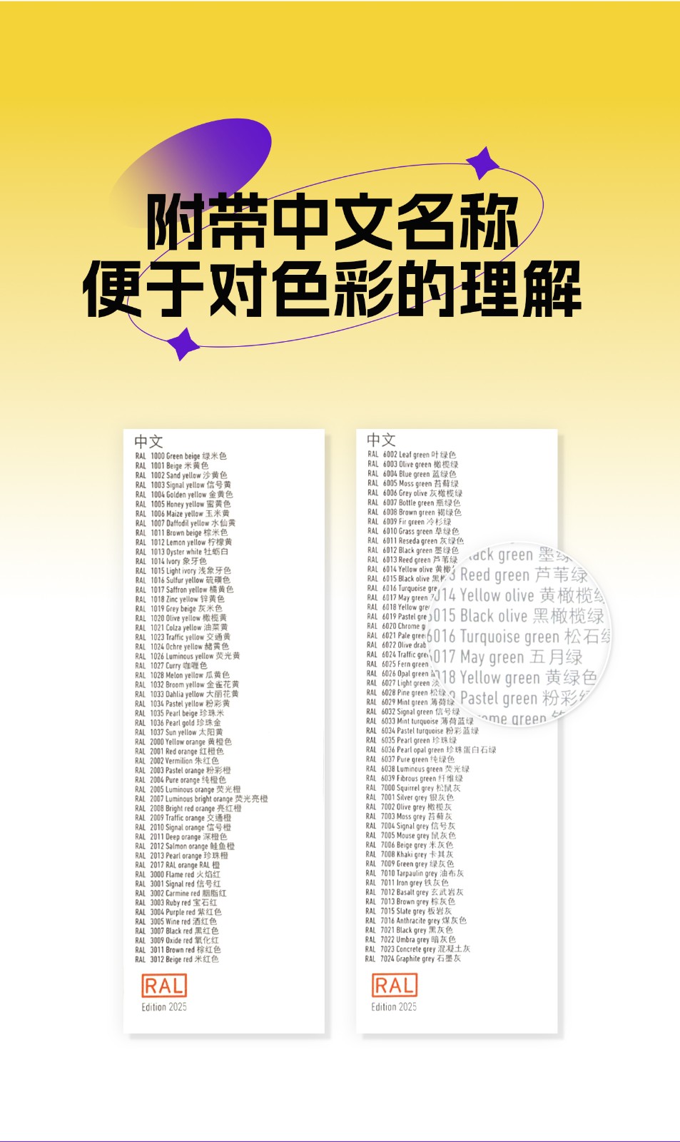 • 具有 RAL Classic 系列的 216 种永恒色调,每页五种颜色