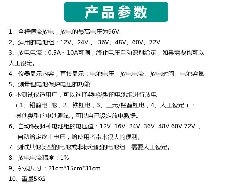 2、放电电池组电压:12V 24V 36V、48V、60V、64V、72V